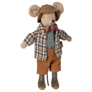 Papa Maus trägt ein Karohemd in fröhlichem Gelb und eine Jeanshose mit gekrempelten Hosenbeinen. Sieht er nicht fesch aus?