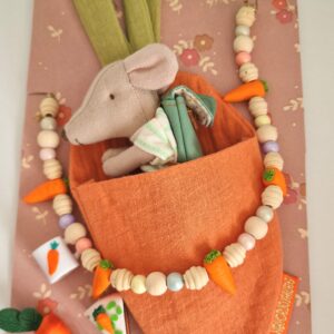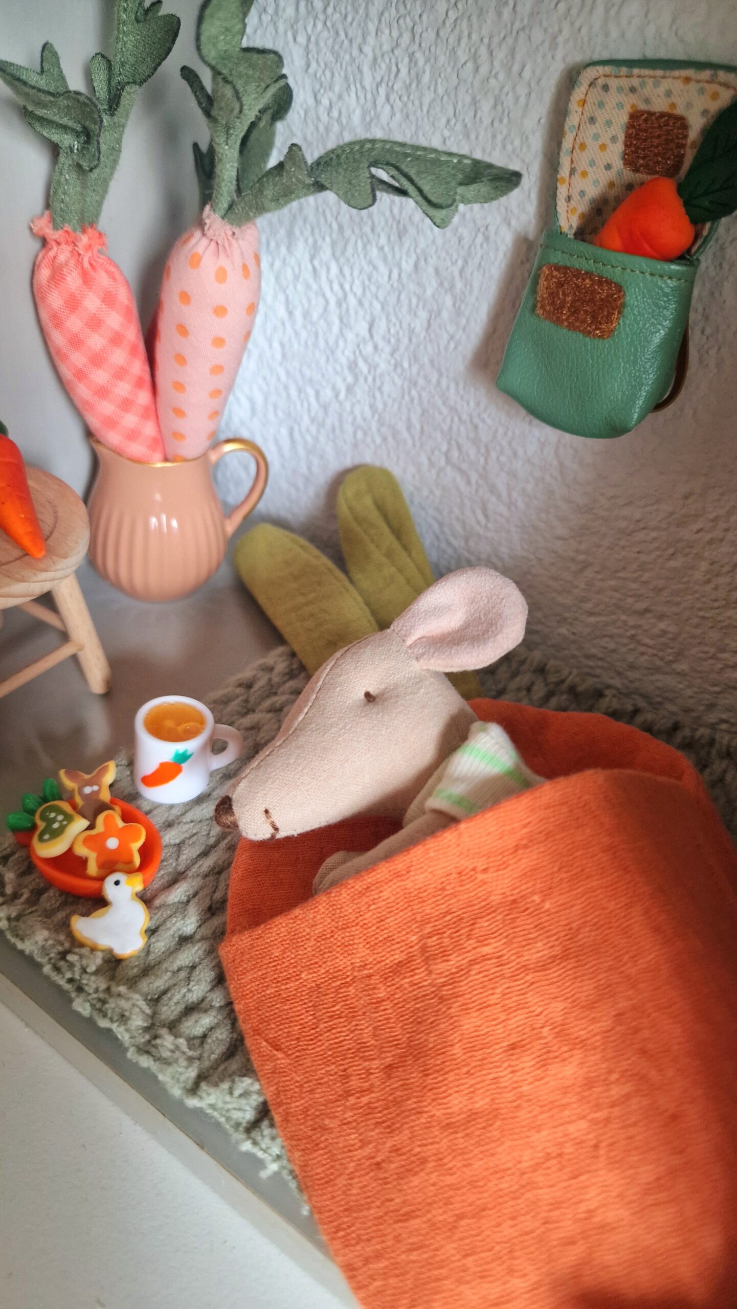 Mit diesem Osterset zauberst Du ganz viel Osterstimmung in Dein Mäusehaus. Im Set enthalten ist eine Dreiradmaus mit Magneten in den Pfötchen und einem Rucksack auf dem Rücken. Dazu gehört ebenfalls ein kuschelig-weicher Karottenschlafsack. eine Karotte aus Fimo, ein Stück Karottentorte aus Fimo und eine Tasse Tee mit niedlichem handbemalten Karottenmotiv. Besonders entzückend finden wir die die kleine Girlande (30 cm) mit schillernden Perlen und Karottenornamenten. Wenn Du eine andere Maus im Schlafsack haben möchtest, kontaktiere uns gerne!