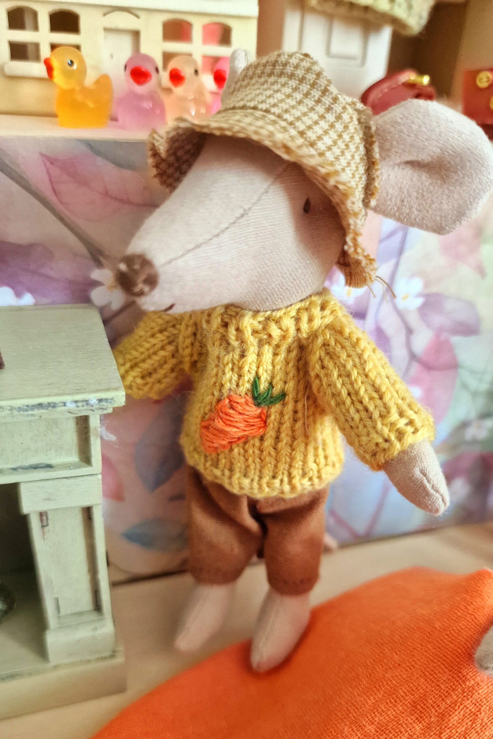 Unsere liebe Kundin Maria hat wieder gezaubert und aus allerfeinstem Garn ist ein süsser Pulli in sanftem Gelbton entstanden. Der Pulli passt der grossen Schwester und dem grossen Bruder. In liebevoller Handarbeit wurde auf der Vorderseite eine kleine Karotte mit Grünzeug aufgestickt. Das perfekte Osteroutfit für Deine Maus! Material: Baumwolle