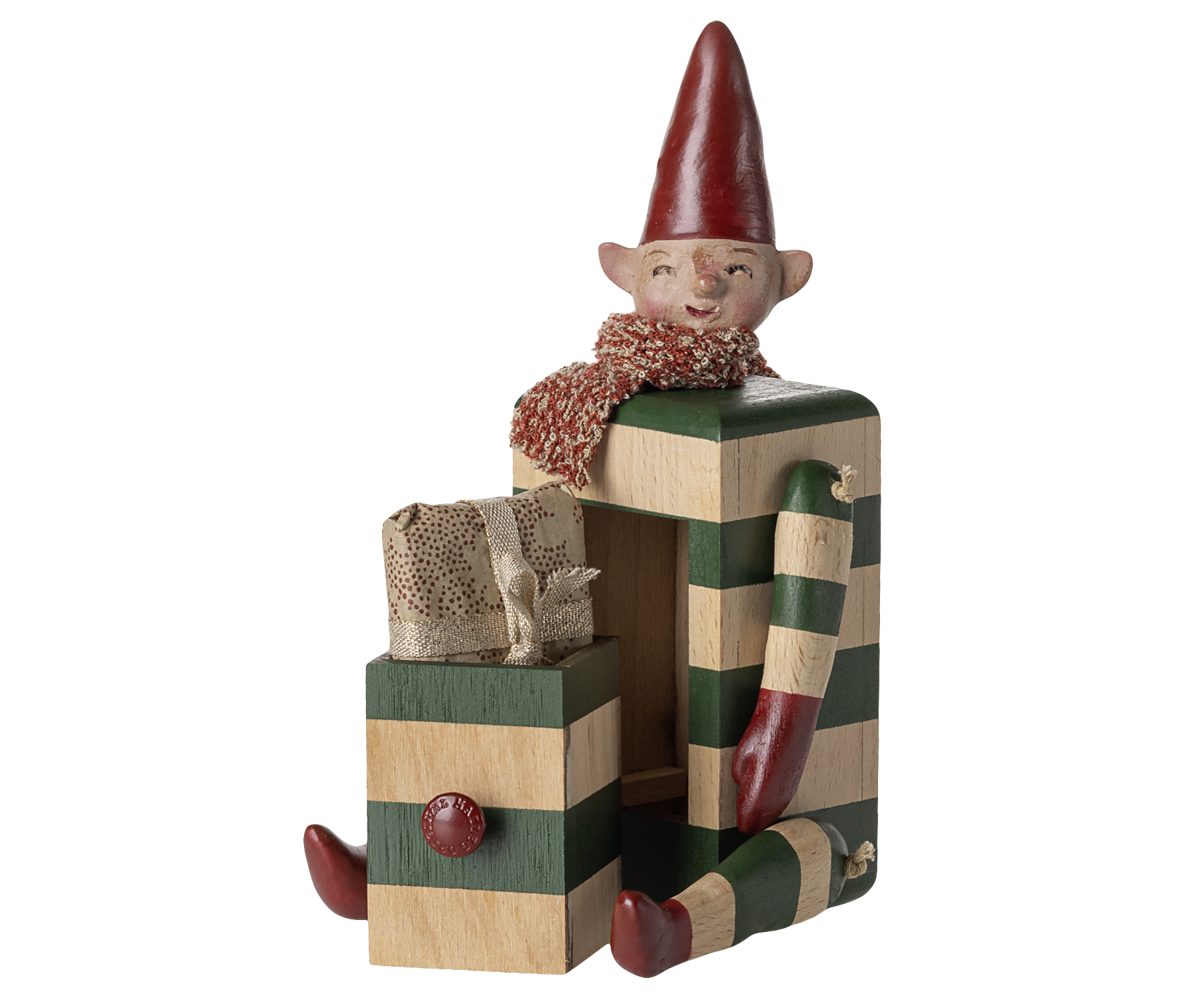 Elf on a shelf war gestern! Jetzt hat der Elf eine kleine Schublade integriert in welcher Du Kleinigkeiten versorgen kannst oder Deine(n) Liebste(n) in der Adventszeit jeden Tag mit einem Pralinée oder einer anderen kleinen Aufmerksamkeit überraschen kannst. Der Korpus ist aus handbemaltem Holz und der Kopf aus Polyresin. Der Elf trägt einen lustigen kleinen Strickschal und bezaubert duch seinem lieben Gesichtsausdruck. Arme und Beine sind beweglich. Maileg hat diesen Elf zum ersten Mal vor zirka 20 Jahren in kleiner Auflage lanciert. Jetzt ist der Elf wieder hier in neuem Gewand und mit viel Weihnachtszauber im Gepäck – pardon in der Schublade! Der Elf entspringt der Fantasie von Dörte Malil, Gründerin von Maileg und ist in einer wunderschönen, karierten und hochwertigen Schachtel verpackt.